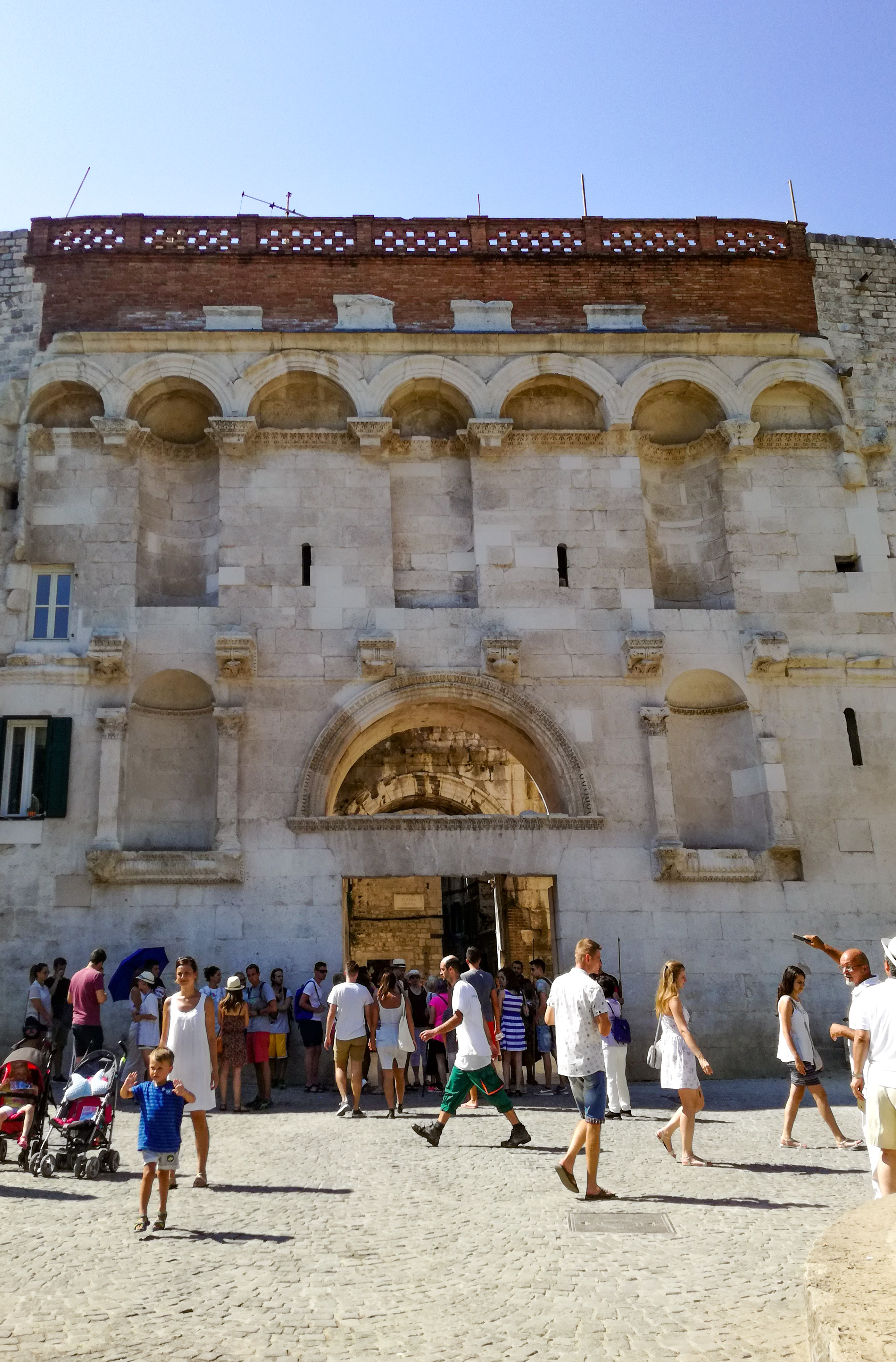 - La Porta Aurea: accesso principale al palazzo, la sua facciata è decorata con le nicchie che ospitavano le sculture dei quattro tetrachi (Diocleziano, Massimiano, Galerio e Costanzo Cloro). Da questa porta, collegata con il Peristilio e il Cardo, la strada portava direttamente a Salona, capoluogo della provincia romana della Dalmazia, e la potevano usare solo l’imperatore e la sua famiglia.