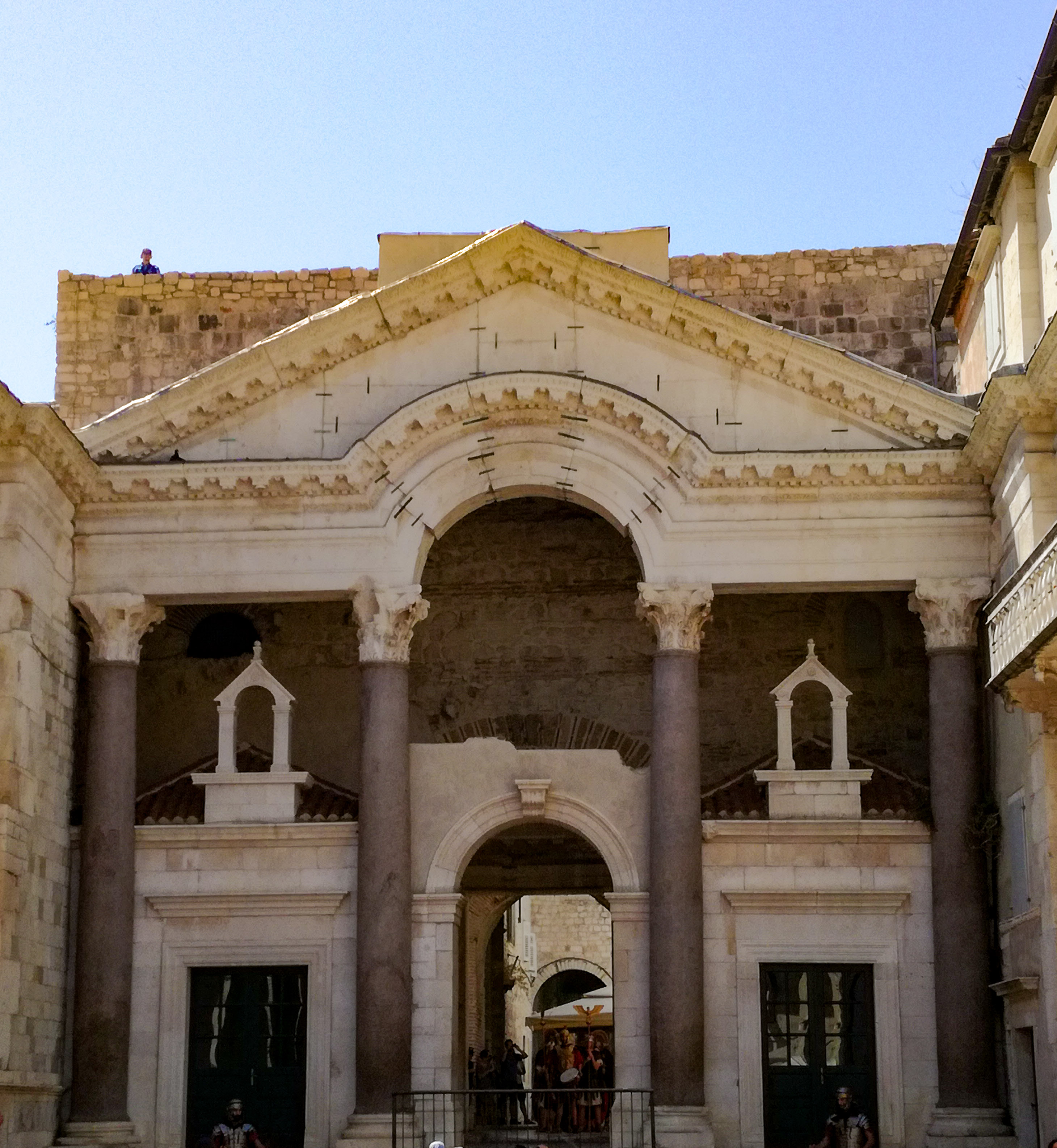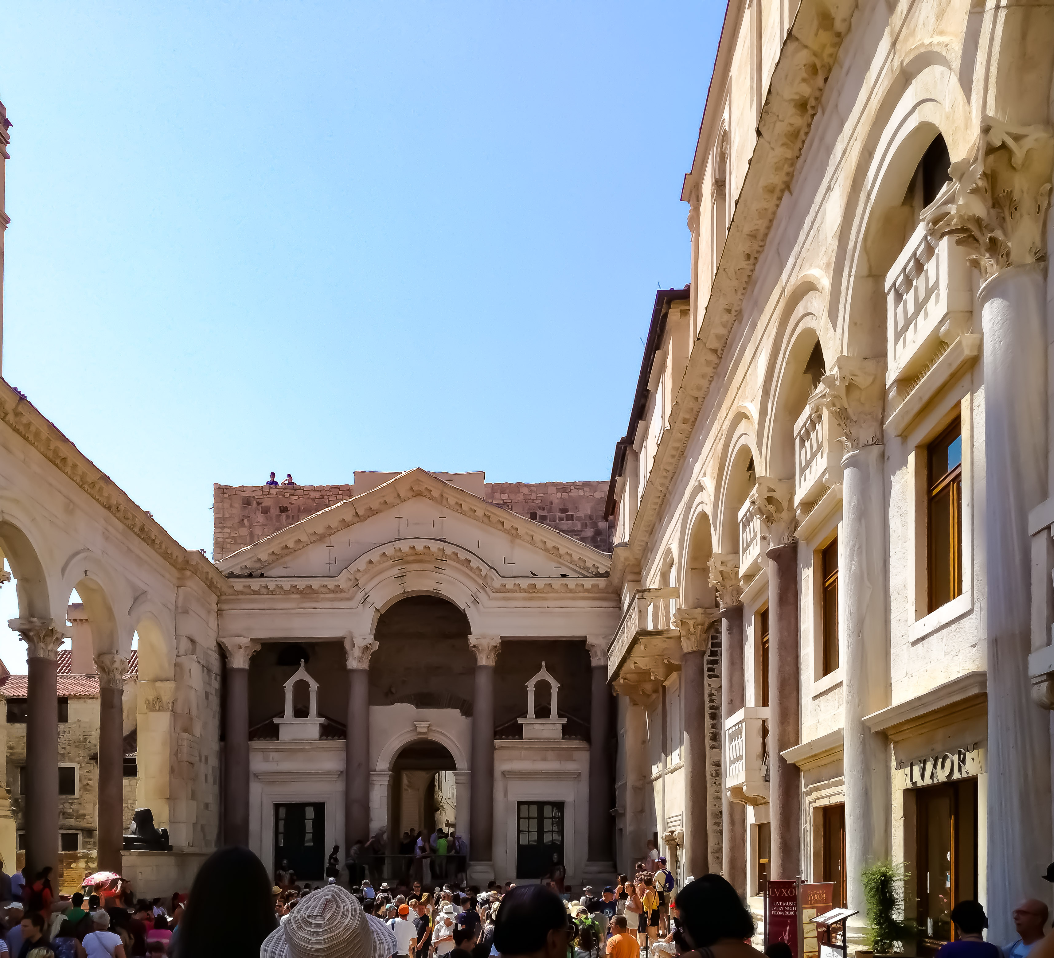 - Il Peristilio: costituisce il cuore di Spalato, la piazza centrale del palazzo intorno alla quale sorgevano più templi, dedicata all’imperatore Diocleziano e situata tre gradini più in basso rispetto alle vie circostanti. Si narra che l’imperatore appariva sotto l’arco dell’architrave centrale, i suoi sudditi gli si avvicinavano e inginocchiati baciavano i lembi del suo mantello purpureo. Grazie alla sua particolare bellezza e insolita acusticità, il Peristilio è diventato palcoscenico teatrale.
