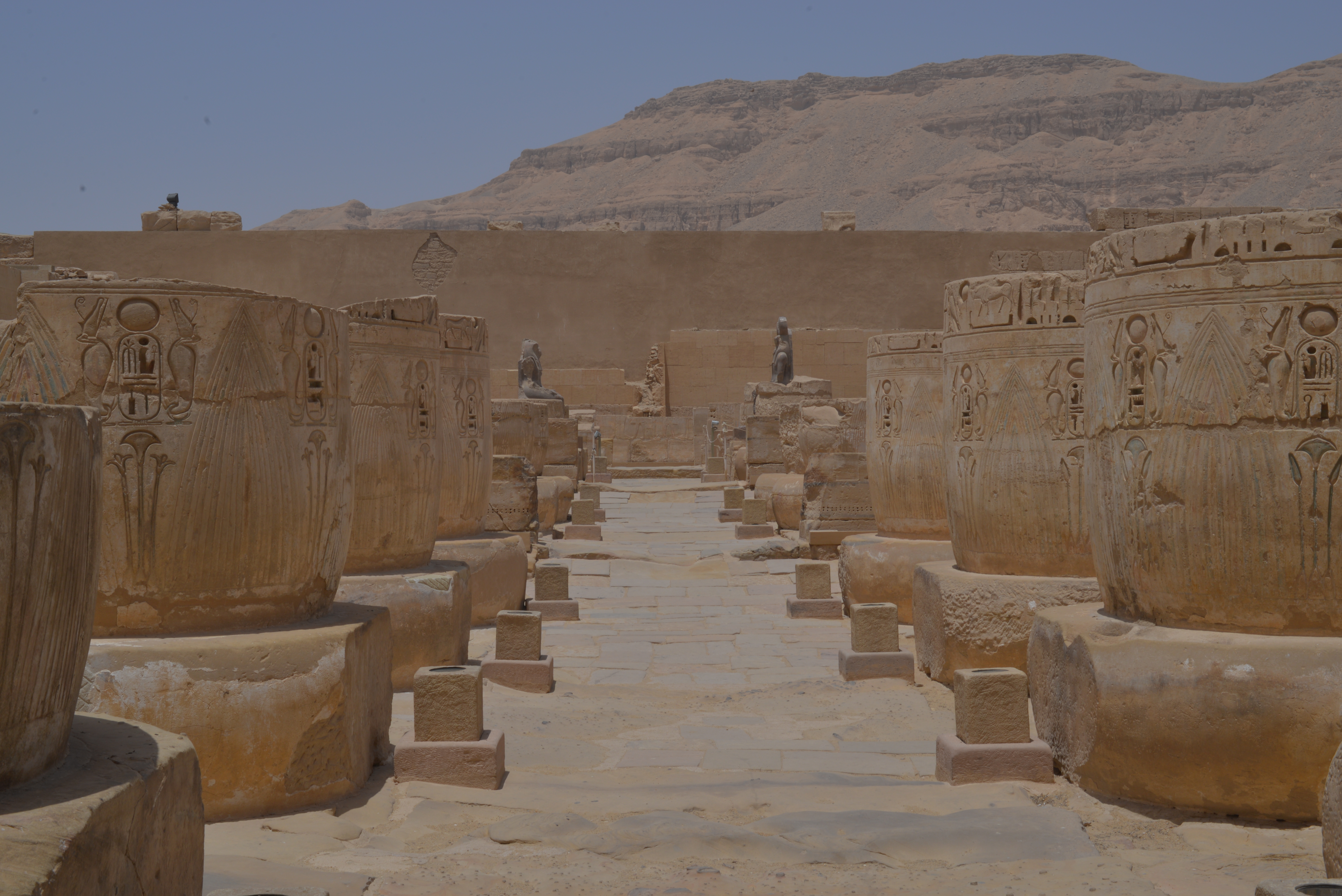 La principale struttura conservata è la sala ipostila, con 8 colonne con capitelli a forma di loto.