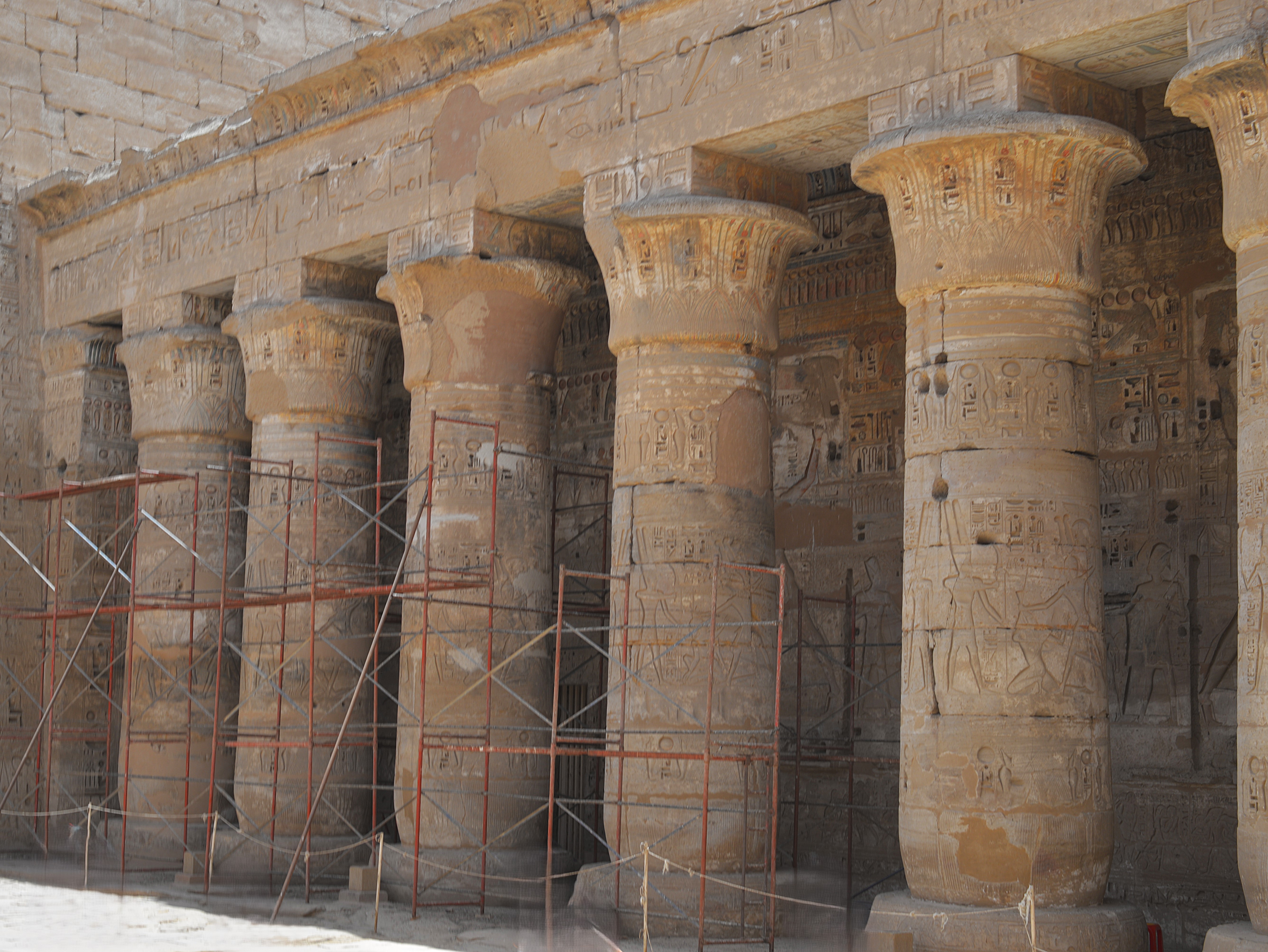 Arrivati davanti al sito, ci si trova di fronte al portale monumentale, una struttura ispirata alle fortezze siriane per commemorare una vittoria in Medio Oriente. Oltre il portale troviamo il cortile con il tempio principale, che sul primo pilone presenta la raffigurazione di Ramesse III che sconfigge i suoi nemici; scene simili si ritrovano anche all’interno del primo cortile, con rappresentazioni della supremazia del faraone.