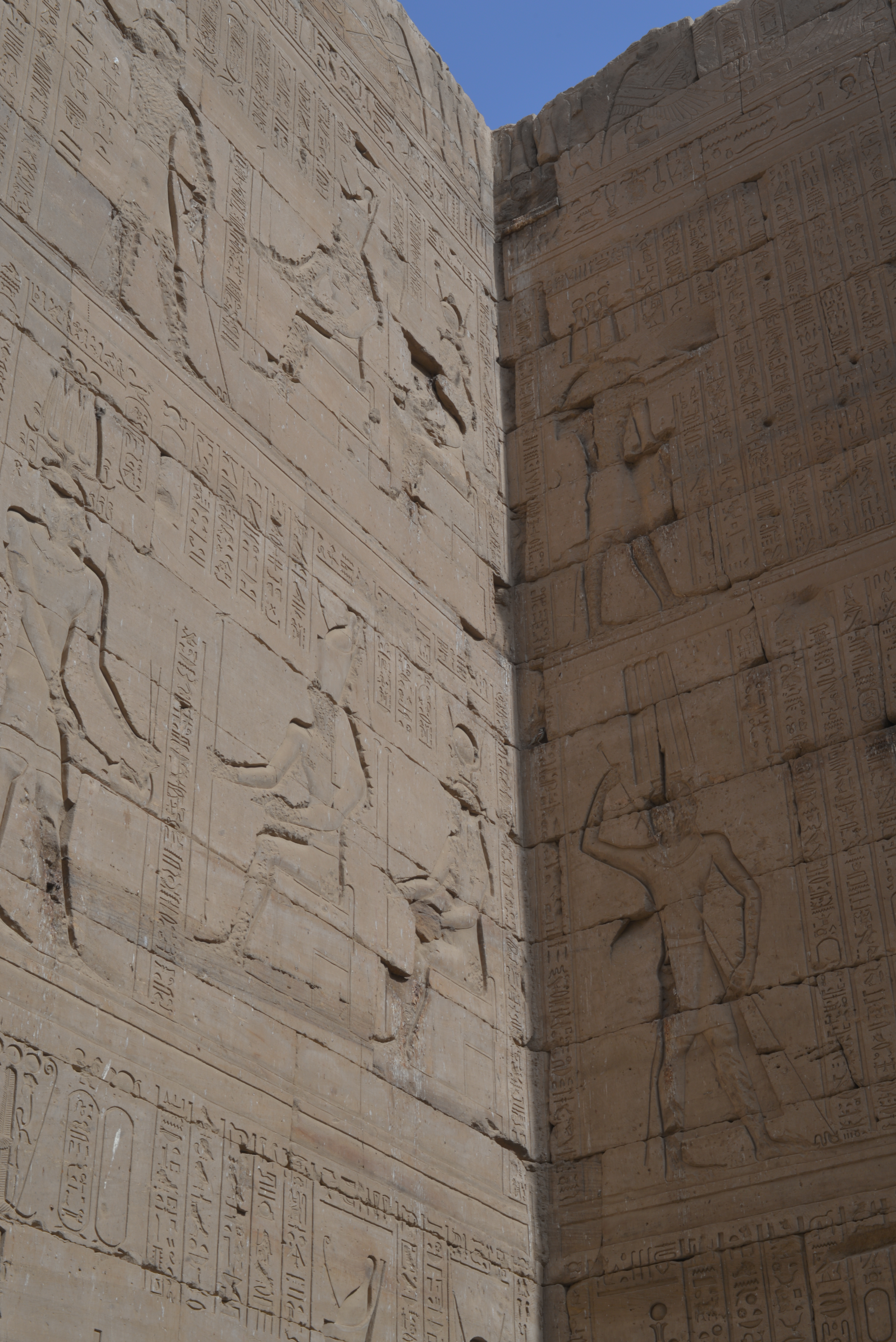 La decorazione delle pareti, che rappresentano le imprese militari dei faraoni e gli onori alle divinità, sono in stile tradizionale (da notare la bidimensionalità delle raffigurazioni).Superata la sala ipostila, troviamo altri tre piloni di dimensioni decrescenti con le rispettive sale ipostile che conducono al santuario, centro spirituale del tempio, ospitante la statua di Amon e la sua barca solare, con cui il dio poteva percorrere i due cieli trasportando il sole ogni giorno all’alba (funzione simbolica) ed essere trasportato in processione lungo il Nilo (funzione pratica).
