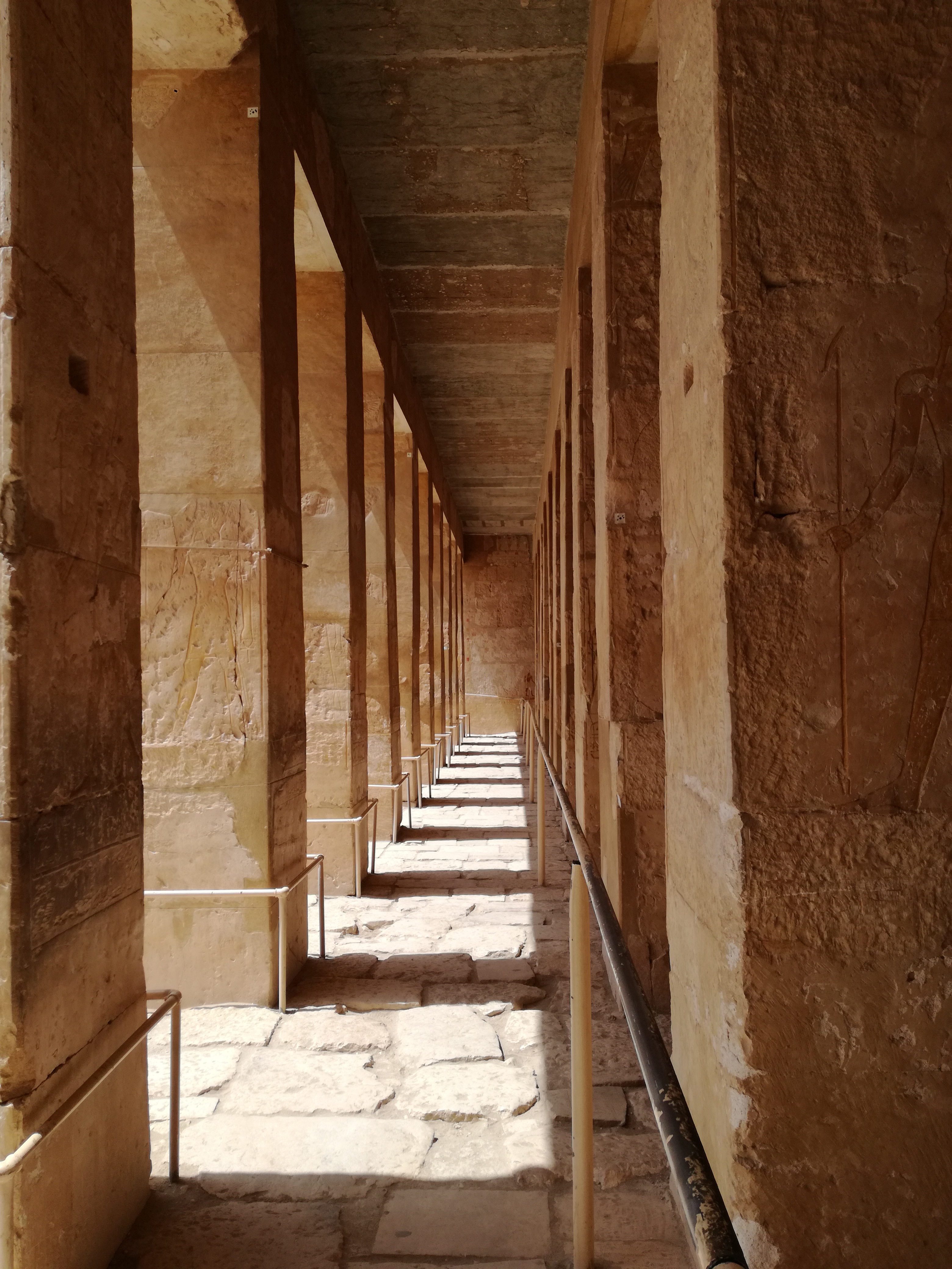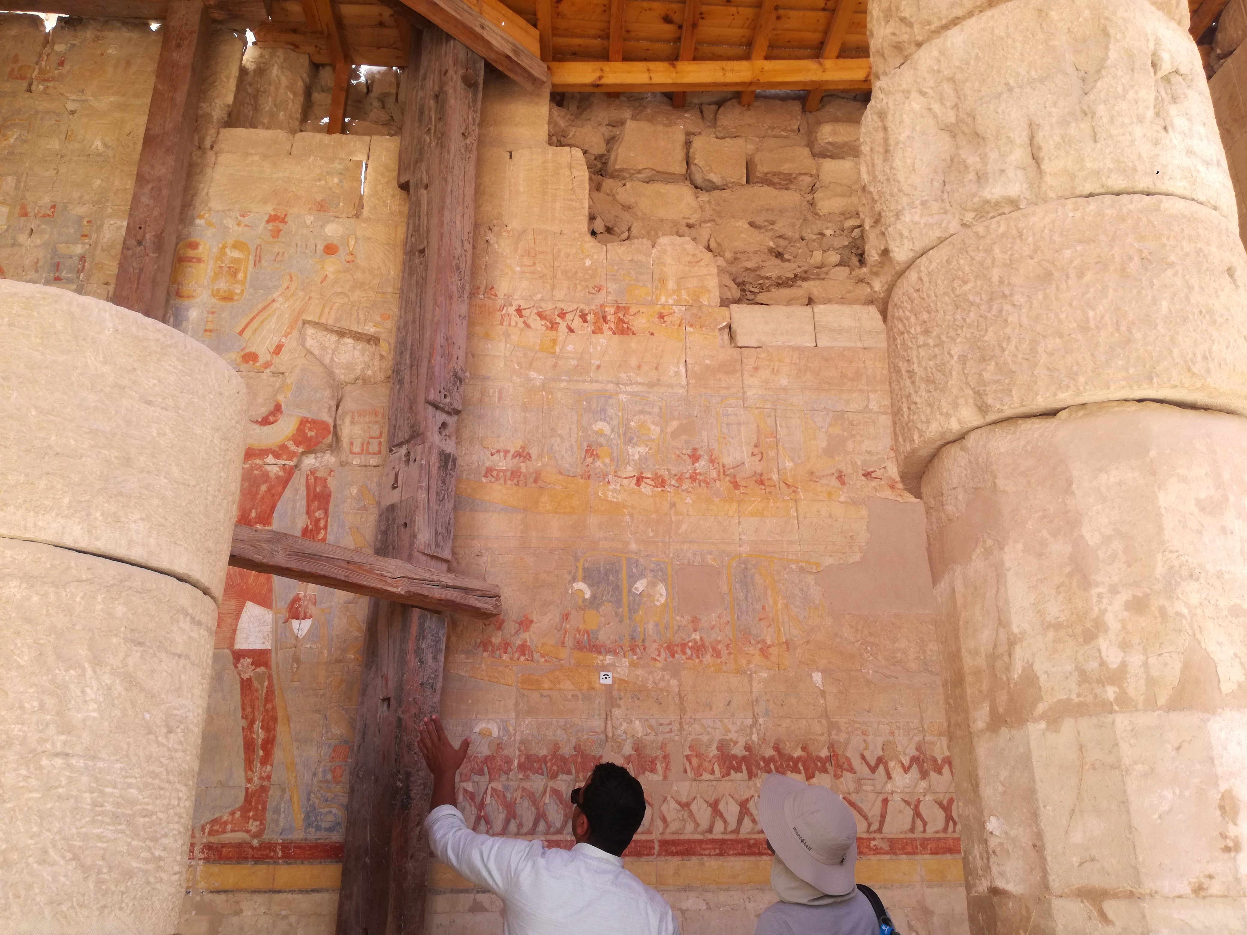 I portici delle terrazze sono decorati con scene dei rituali del Basso Egitto, la nascita divina della regina e il suo trionfo sui nemici (a nord) e scene relative all’estrazione degli obelischi dalla cava e trasporto al tempio. Purtroppo la maggior parte di statue e ornamenti è stata rubata o distrutta: in particolare non vi sono raffigurazioni superstiti della regina Hatshepsut perché furono fatte rimuovere dal figliastro Thutmosi III, al quale la regina aveva usurpato il trono.