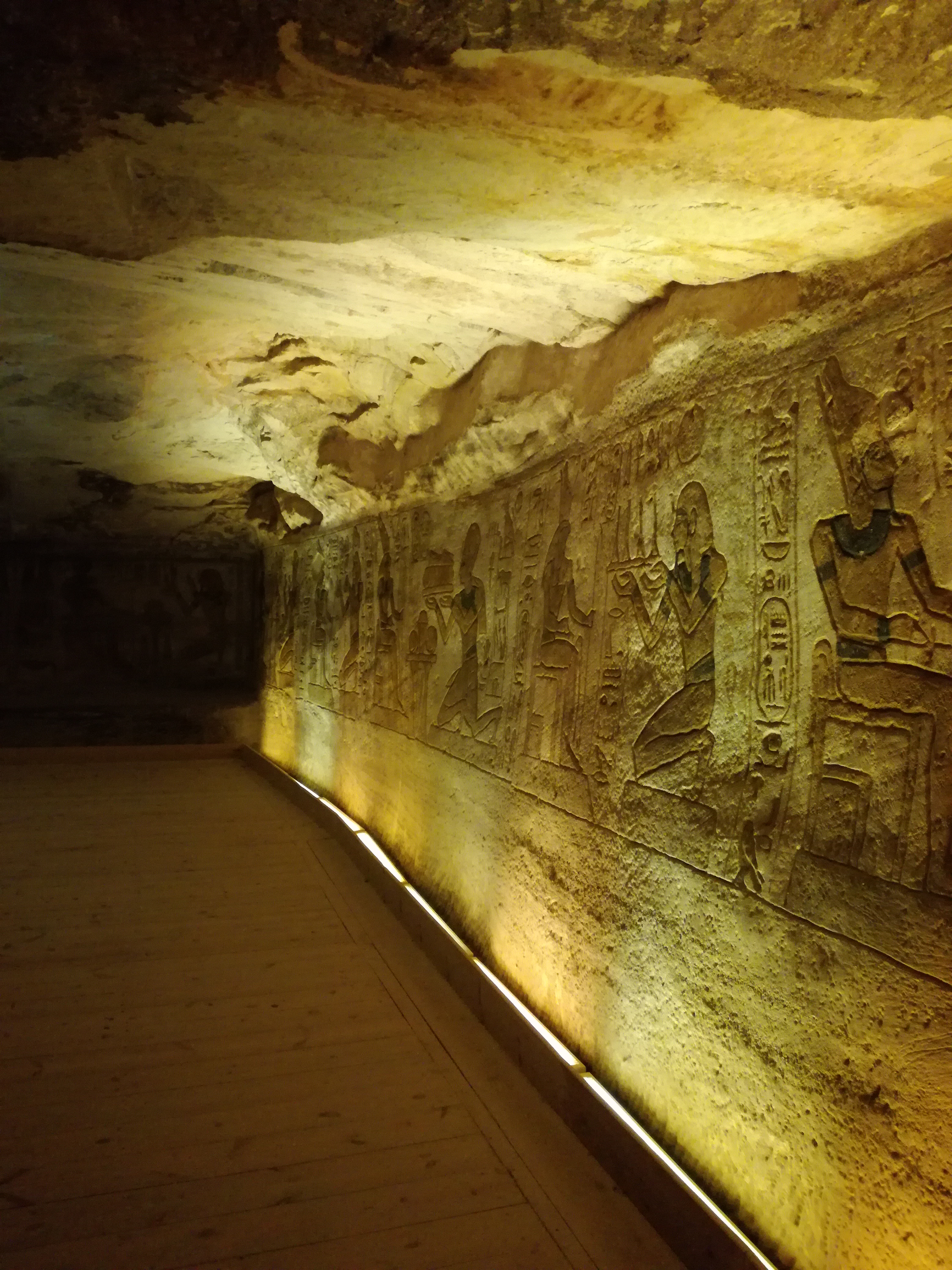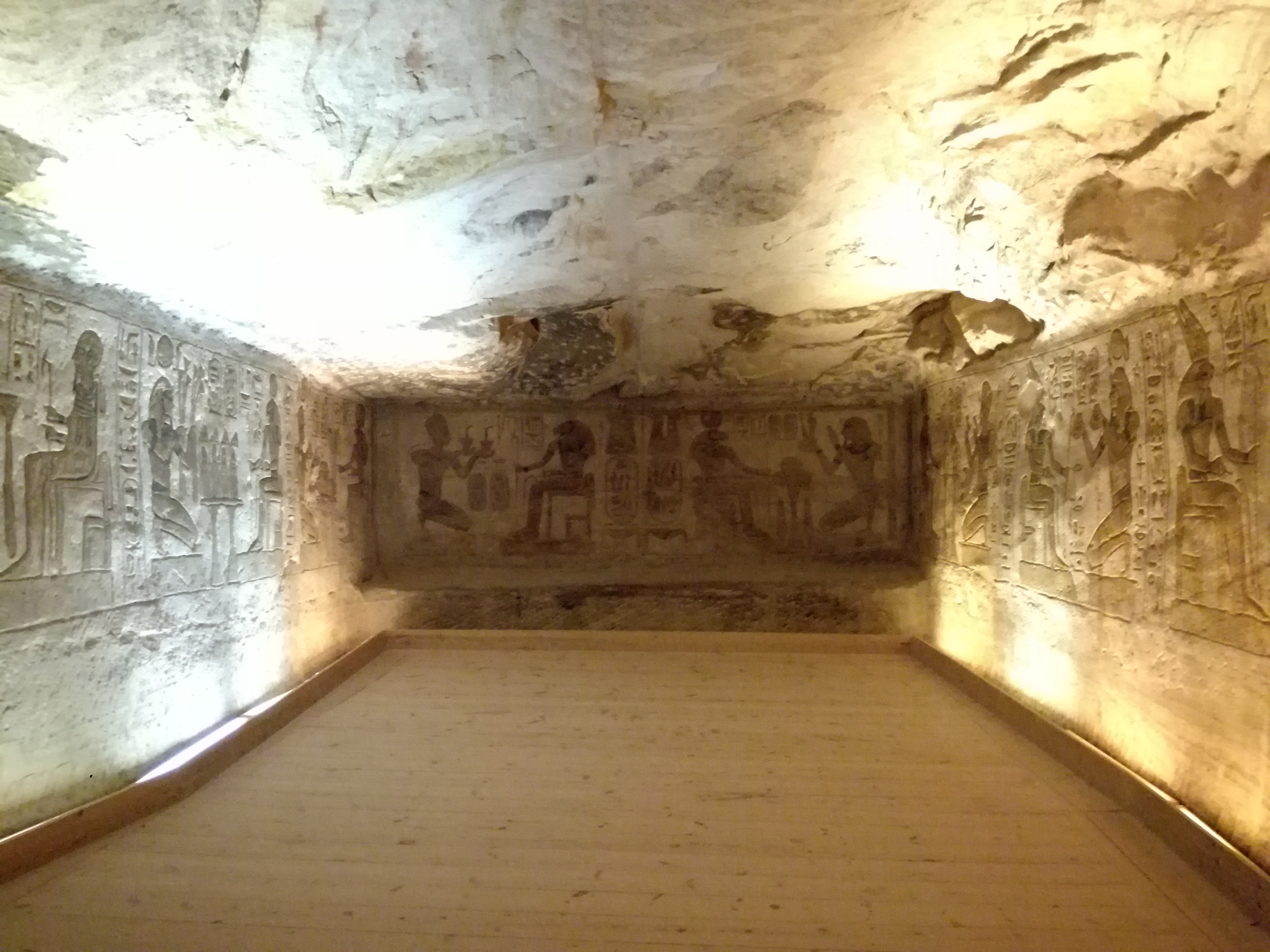 All’interno, man mano che si avanza, il pavimento si alza e il soffitto si abbassa per creare la prospettiva che ha il suo punto focale nel sacrario. Nel sacrario ci sono le quattro statue di Ramses II divinizzato, Amon, Horus e Ptah: due volte l’anno, il 21 febbraio e il 21 ottobre, i raggi solari penetrano e illuminano le prime tre statue (non Ptah perché non è una divinità solare) per rendere visibile l’invisibile, grazie a precisi calcoli astronomici.