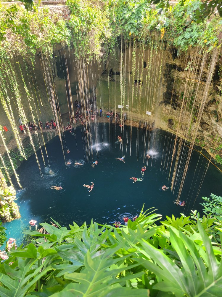 Nel pomeriggio abbiamo visitato il Cenote Ik Kil, uno dei più famosi dello Yucatán. Si tratta di un cenote a cielo aperto, circondato da una vegetazione rigogliosa che scende fino all’acqua. Nuotare nelle sue acque fresche e turchesi è stato il modo perfetto per rinfrescarsi dopo il caldo. In epoca maya, Ik Kil era considerato un luogo sacro e utilizzato per rituali religiosi.