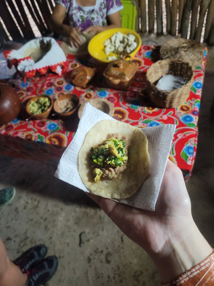 Prima di ripartire, abbiamo gustato uno snack tipico a base di riso, fagioli, taco di pollo e una fresca agua de limón, semplice ma molto apprezzato dopo una mattinata intensa.